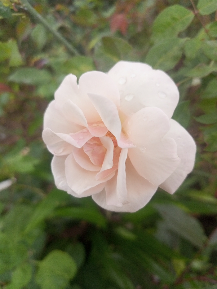 A close-up photograph, taken in the city of Bamhori, India, displays a single, fully opened rose bloom. The rose exhibits numerous pale pink to off-white petals, with a slightly darker pink coloration in its central whorl. Multiple clear water droplets are visible adhering to the surfaces of the outer petals. The background consists of out-of-focus green foliage with intermittent hints of reddish-brown, consistent with a natural garden environment. No human subjects or active events are depicted.