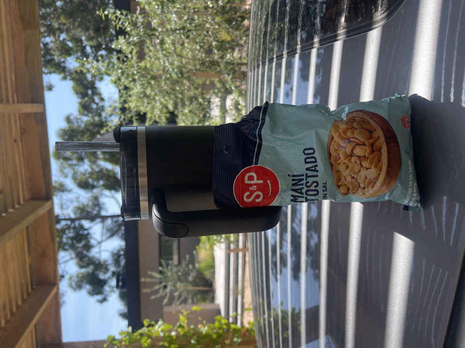 A black insulated mug with a handle, clear lid, and metallic straw stands upright on a reflective, dark gray surface. Resting against the mug is an open light blue bag of "S&P Maní Tostado Sin Sal" (Toasted Peanuts Without Salt), partially filled with peanuts, visible through an image on the bag. The scene is set outdoors in La Barra, Uruguay. A wooden slatted pergola structure is visible overhead, casting distinct parallel shadows across the reflective surface. In the background, under a clear blue sky, are numerous green trees and a modern building with a dark facade. No individuals are present, and the objects appear stationary in bright daylight.