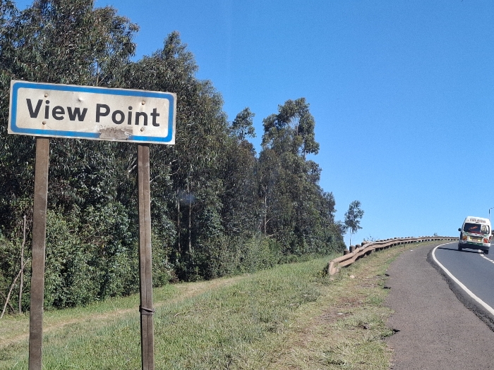 A sign reading "View Point" is mounted on two wooden posts, with the sign facing a road with a guardrail. The sign is located on the edge of a grassy area, with a forest of trees behind it. There is a white minivan driving on the road in the distance. The location is a viewing point along a road in Escarpment, Kenya, at latitude -1.025 and longitude 36.622. The sky is blue with no clouds. The road is paved with asphalt. The guardrail is made of metal. The grass is green. The trees are tall and leafy. The minivan is a small passenger van with a white body and a red stripe running down the side. There is no one visible in the image.