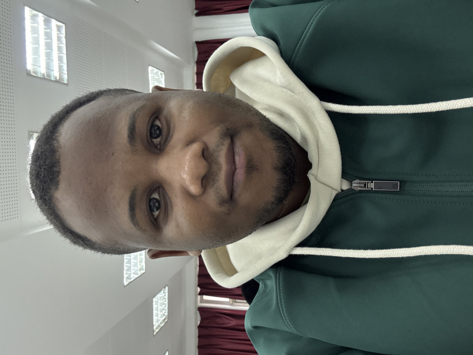 A man's face fills the frame, slightly off-center. He has short, dark hair and a neatly trimmed beard. His eyes are dark and his skin has a warm, brown tone. He wears a dark green jacket with a cream-colored hoodie underneath. The jacket is zipped up, revealing a small, rectangular zipper pull. In the background, there's a blurred view of a room with white walls and windows. Maroon curtains are visible further back. The image has a slightly washed-out, indoor lighting.