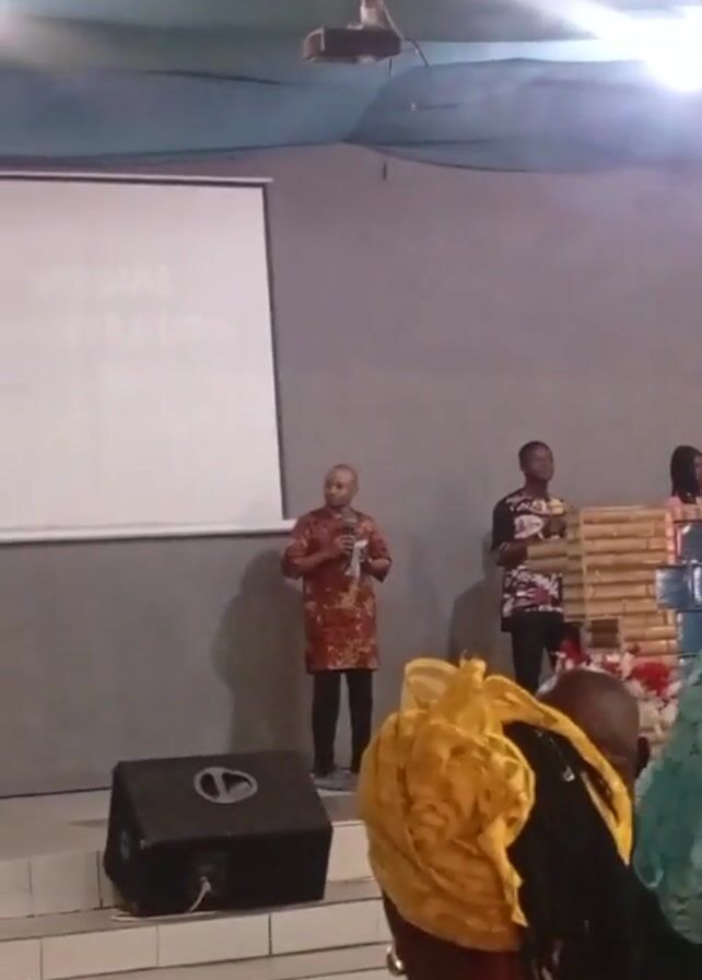stage with four people standing behind a lectern. The stage also has a screen, a speaker, and stairs. A man on the left is speaking into a microphone. The crowd is made up of people, mostly women. There's a ceiling fan and lighting installed above the stage.