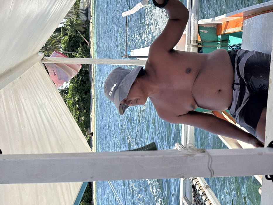 An adult male is observed sitting shirtless in a moving Filipino outrigger boat (*bangka*) on clear blue-green water, under a bright sky in General Luna, Philippines