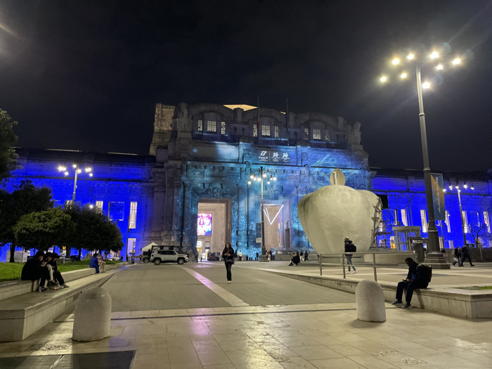 - "The image displays a nighttime view of the Milano Centrale railway station in Milan, Italy, its grand facade illuminated with vibrant blue light" by FM-d5fJ32, licensed under CC BY 4.0