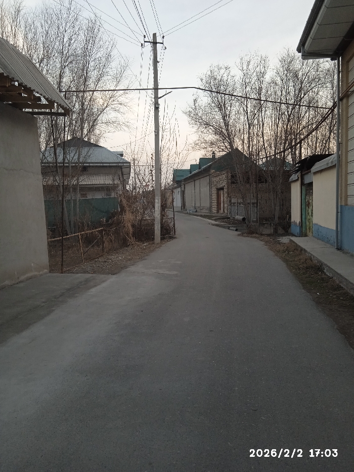The image displays an empty, paved street in Andijan City, Uzbekistan, captured on February 2, 2026, at 17:03. The asphalt road, devoid of vehicles or pedestrians, curves gently towards the right and recedes into the distance under an overcast, light gray sky. On the immediate left, a portion of a building's light-colored wall with a corrugated metal roof is visible. Adjacent to it, a patch of barren ground contains dry vegetation and a low, rusted metal fence. Further along the left, a residential structure with a gray sloped roof and light-toned walls is partially obscured by numerous bare deciduous trees. A prominent gray utility pole stands in the midground, supporting multiple overhead power lines that extend horizontally and diagonally across the upper frame. A street light arm is attached to the pole. On the right side of the foreground, a raised concrete sidewalk runs parallel to the road. Beyond the sidewalk, a series of buildings line the street. The closest structure features a light beige facade with a blue painted base and a dark green door, topped by a dark, possibly corrugated, overhang. Further down the street on the right, a longer, single-story building with a green roof and light-colored walls, possibly brick or stucco, is visible, also partially screened by bare trees. No individuals or active subjects are present in the scene. The environment suggests an urban or suburban residential area during a cold season, characterized by dormant vegetation and overhead utility infrastructure.