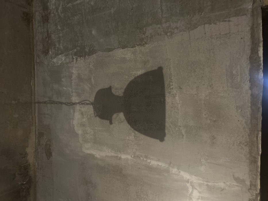 The scene depicts an interior space within a building in the city of Unknown, Unknown. A prominent, dark shadow of a hanging light fixture is cast upon a rough, light gray concrete wall, which exhibits uneven textures, patches, and variations in tone consistent with an aged or utilitarian structure. The shadow, positioned in the upper-center of the frame, details a bell-shaped luminaire suspended by a visible chain extending upwards out of view. No individuals or active subjects are present. A sliver of bright artificial light is visible at the bottom edge of the frame, suggesting a light source below or an adjacent space.