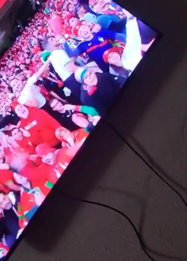TV screen mounted on a wall displaying a soccer game between Nigeria and Morocco, with the score 0-0. First, there is a shot of a crowd of fans in red and green attire. Then, the screen shifts to show two men embracing, one in a red soccer uniform and the other in a blue jacket. They are facing each other and tightly holding one another. There's a desk and a figurine in the background.