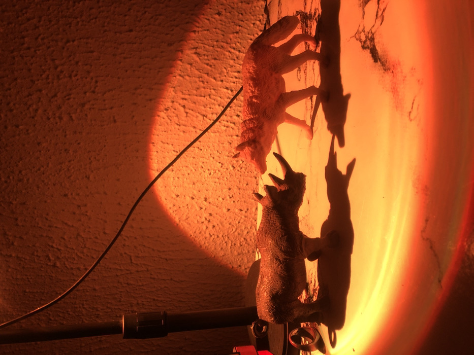 Two plastic toy dinosaurs, a wolf and a Triceratops, are positioned against a textured wall, illuminated by a strong warm light source