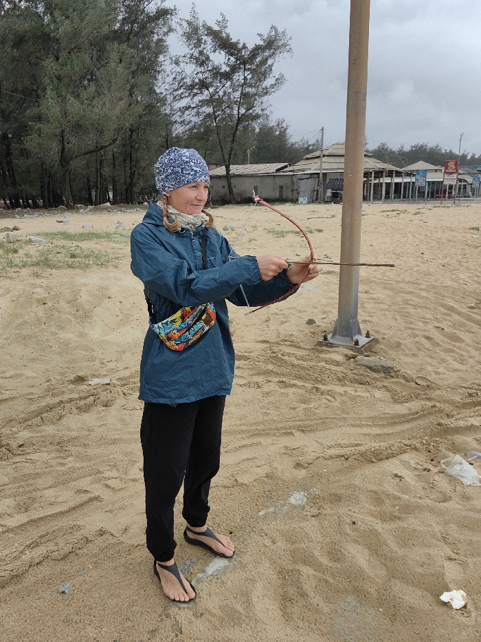 An adult female stands on a sandy beach or coastal area in Thuận An Ward, Vietnam, under an overcast sky. She is positioned facing slightly right, smiling subtly, and holding a reddish-brown, natural-material bow with a string that has a small, light-colored decorative element near its top. Her right hand holds the bow, and her left hand grips a straight wooden stick serving as an arrow, pointing forward. The woman wears a blue and white patterned beanie, a teal long-sleeved jacket, a multicolored fanny pack across her front, black pants, and black thong-style sandals. Her hair is light-colored and styled in two braids on the sides of her head. To her right, a tall, light brown metal pole with a grey bolted base extends vertically from the sand. The ground is composed of light brown sand exhibiting footprints and scattered small pieces of white debris. In the background, a line of tall, slender trees with green foliage provides a backdrop. Beyond the trees and to the right, multiple low-rise buildings are visible, including simple structures and larger commercial buildings, one featuring a multi-tiered roof and signage that partially displays "SAIGON." The sky is uniformly grey and cloudy.