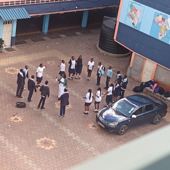 The scene depicts an outdoor paved courtyard within an educational institution in Nairobi, Kenya