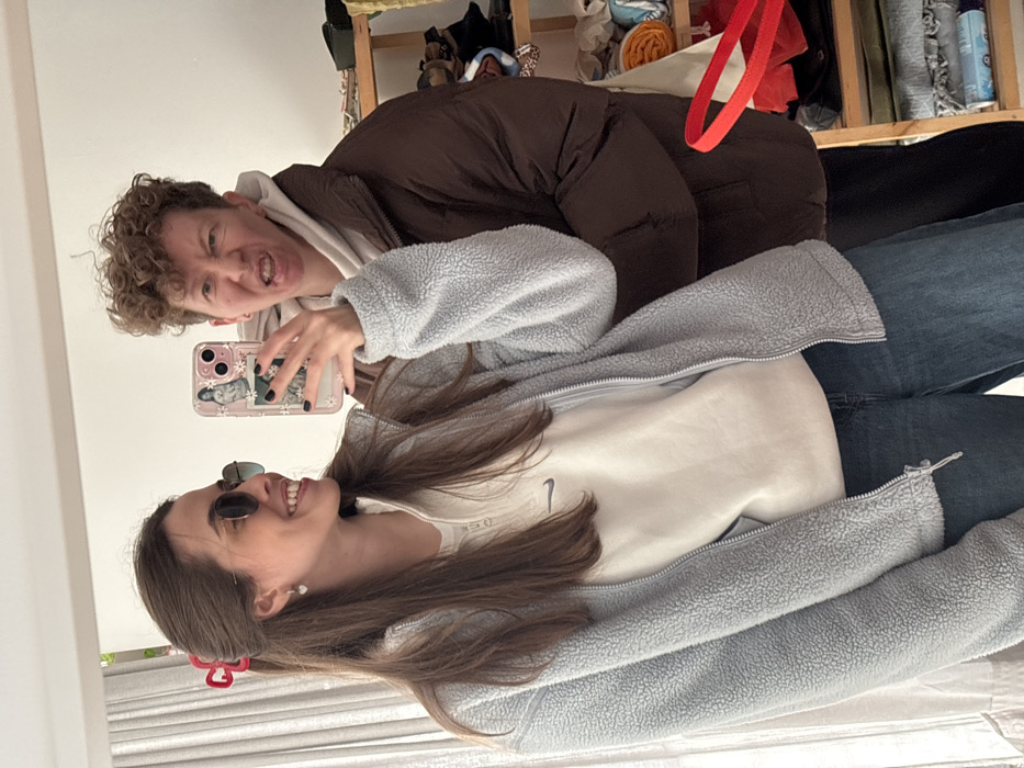 An indoor mirror selfie features two individuals