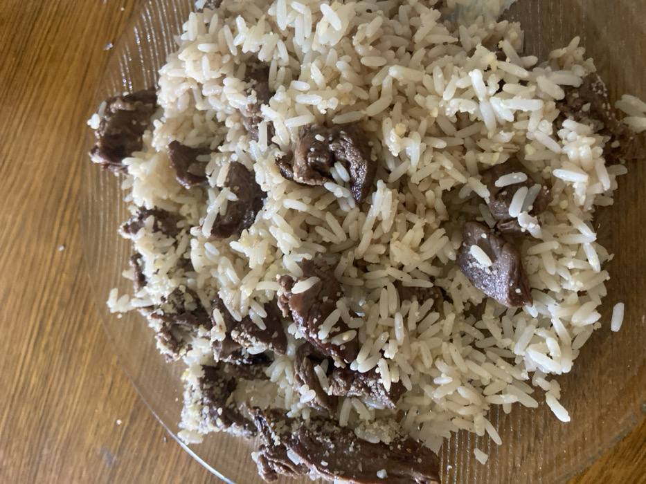 A plate of rice and meat. The rice is a pale tan color with individual grains clearly visible. Mixed in with the rice are pieces of cooked meat, appearing dark brown or reddish-brown. The meat chunks are irregularly shaped and distributed throughout the rice. The dish is presented on a clear glass plate. The plate sits on a wooden surface. The meal is simply presented without additional garnishes.