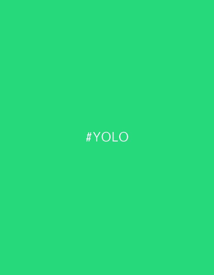 The scene is located in the city of Unknown, Unknown. The image displays a uniform, bright green background. Centered on this green field, the white text "#YOLO" is present in uppercase characters. No people, other subjects, objects, actions, or interactions are discernible within the frame. The environment consists solely of the solid color background and the superimposed text.