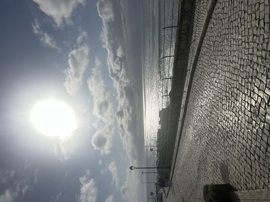 The image depicts a coastal scene in Ericeira, Portugal, under bright, partly cloudy daylight conditions. A prominent, intensely bright sun, slightly to the upper left of center, illuminates the scene, casting strong reflections on the water and the wet cobblestone pavement. The sky in the upper portion of the image features scattered white cumulus clouds against a blue background, with some darker, heavier cloud formations closer to the horizon. The ocean occupies the mid-right and extends to the horizon, displaying visible waves and a broad, shimmering band of sunlight reflecting off its surface. In the foreground and mid-ground, a cobblestone promenade, constructed from irregularly shaped light-colored stones (calçada portuguesa style), dominates the lower half of the frame. The cobblestones appear wet and highly reflective due to the sunlight. The promenade curves gently to the left. A low stone wall, topped with dark, curved metal railings, separates the promenade from the ocean. Along the left side of the promenade, two traditional black streetlights with ornate bases are visible. Further down the path, several parked vehicles are visible on an adjacent section of the road or parking area. Two indistinct human figures are walking leftward on the cobblestone path in the mid-left section of the image. A circular metal manhole cover is visible embedded in the cobblestones in the lower-left foreground, near a small planter containing greenery. The general appearance of the pavement suggests it is either recently wet or constantly exposed to sea spray.