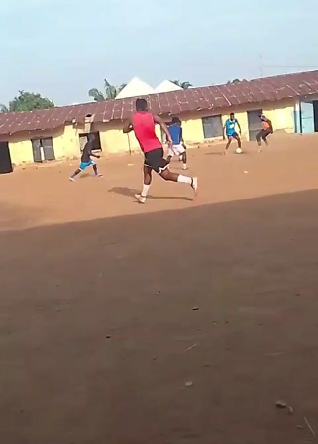 group of people playing soccer on a dirt field. The players are wearing different colored jerseys and shorts. There are some buildings in the background. The sky is blue and the sun is shining. The camera is handheld and shaky. The players are kicking the ball around and running across the field. The video appears to be taken during a casual game of soccer.