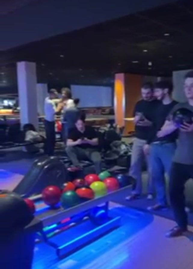 The video captures a bowling alley bustling with activity, filled with people of varying ages and genders, some standing and talking, others seated and occupied with their phones