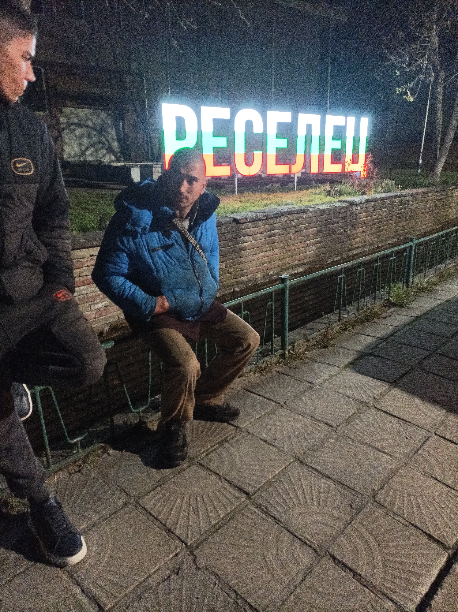 Two males are present. One is standing, wearing a dark-colored jacket and pants, and partially cut off on the left side of the image. The second male is seated on a green metal fence. He is wearing a blue jacket and tan pants. Behind him is a low brick wall. Behind the wall is a sign that reads "РЕСЕЛЕЦ" which is illuminated with the colors of the Bulgarian flag. The ground is made of concrete slabs with a radiating pattern. There is a tree on the right side. This appears to be in Reselets, Bulgaria.