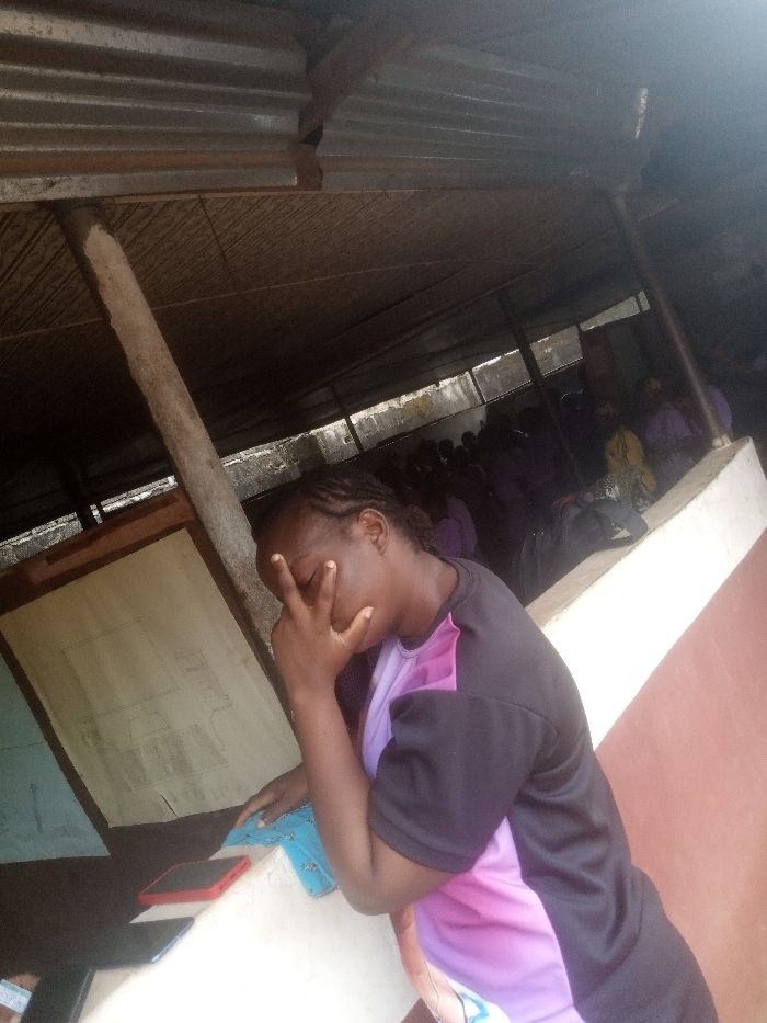 The scene is an open-sided structure in Ukwu-Abwa, Nigeria, featuring a corrugated metal roof supported by wooden posts. In the foreground, a young Black female with braided hair wears a black and pink/purple short-sleeved top. She is seated or leaning, with her left hand obscuring part of her face. Her right hand rests near a red-cased smartphone and a blue patterned cloth on a low white concrete partition. A vertical board with a faint diagram on light-colored paper is to her left. The background shows multiple individuals, likely students, wearing purple attire, seated in rows within the dimly lit interior. Backpacks are visible on the ground. A concrete wall with horizontal openings is present at the far back.