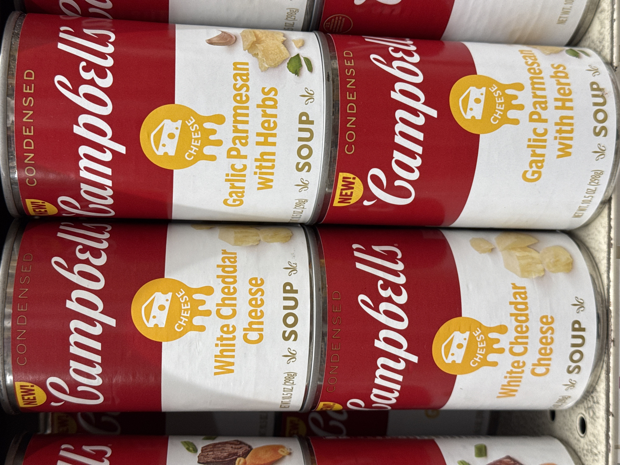 - "The scene depicts multiple cans of Campbell's Condensed Soup displayed on a light gray, perforated metal retail shelf, characteristic of a grocery store aisle in Santa Monica, United States of America" by FM-cO6sC3, licensed under CC BY 4.0