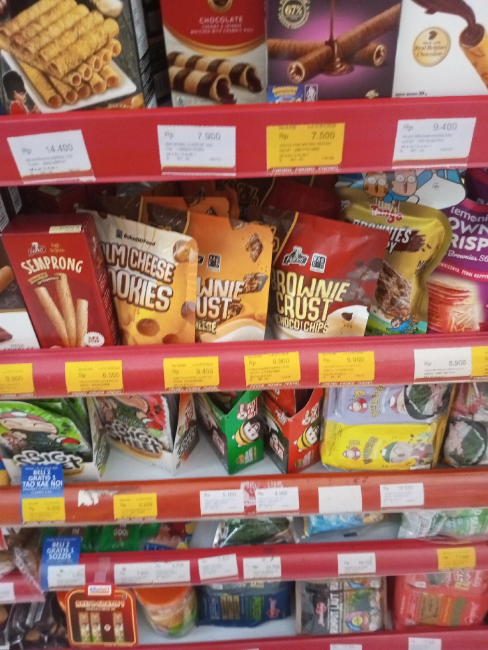 A supermarket shelf displays various snacks. The top shelf holds wafer rolls, including chocolate flavors, priced from Rp 7,500 to Rp 14,400. The second shelf showcases cookies and brownie chips from brands like BakedD Food and Fabello, with prices ranging from Rp 6,500 to Rp 9,900. Below, there are seaweed snacks like Big and Sozzis and other packaged goods. Price tags are visible beneath each item.