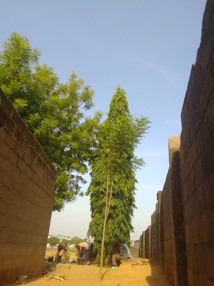The image depicts an outdoor scene in Saminaka, Nigeria, characterized by an unpaved reddish-brown earth ground. Unplastered concrete block walls define the boundaries: a lighter-toned wall on the left extends upwards, partially obscuring a large, broad-leafed green tree. A darker, buttressed concrete block wall on the right extends into the background, narrowing the passage. Overhead, the sky is clear blue. A tall, slender, conical-shaped tree with dense green foliage stands centrally. In the mid-ground left, two adult males are bent over, interacting with items on the ground. One wears a dark shirt, the other a plaid shirt. Near them are multiple colored plastic basins or buckets (red/orange, green, white) and possibly hanging fabric in the background. A third adult male is seated on a low concrete block beneath the tall tree to the right, wearing a light-colored shirt and dark pants, and is observing a mobile device held in his hands. Several pieces of cut wood are present on the ground in the foreground. No direct interaction between the individuals is evident.