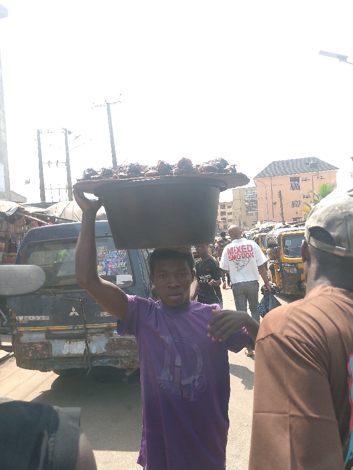 The image captures a bustling street scene in a commercial district of Onitsha, Nigeria, illuminated by bright daylight. In the central foreground, a young adult male, of dark complexion and wearing a purple t-shirt, carries a large, dark-colored basin filled with numerous pieces of cooked meat (likely on a wooden tray) balanced on his head, supported by his raised left arm. He looks directly forward. Partially obscuring the right foreground is the back of a person's head, wearing a brown t-shirt and a camouflage-patterned baseball cap. Behind the central figure, an older, dark-colored Mitsubishi pickup truck, featuring rust and visible rear-end damage, is stationary. The street surface appears uneven, composed of dirt or worn asphalt, and is actively populated by pedestrians. Several individuals are visible in the mid-ground; one man, seen from behind, wears a white t-shirt with "MIXED EMOTION" printed in red across the back. To his left, another man in a black t-shirt is walking. On the right side of the street, multiple yellow and black tricycles (commonly known as Keke Napep) are either parked or in motion. Overhead utility poles and power lines are visible against a bright, partially overexposed sky. Various multi-story buildings, including one with a distinctive dark grey hip roof, line the background, interspersed with what appear to be market stalls or temporary structures.