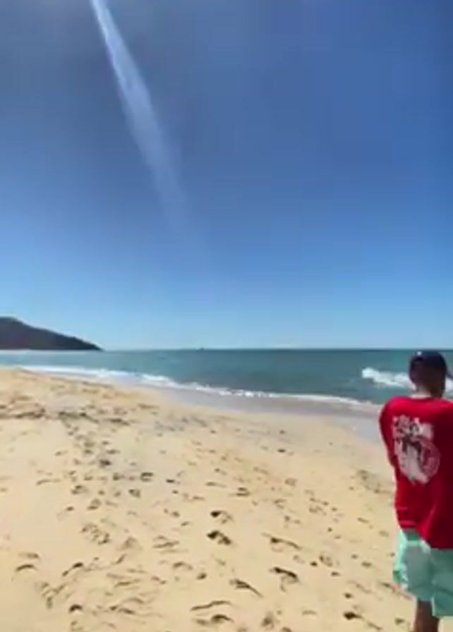 sunny beach with clear blue skies and calm, turquoise water. The sand is light-colored and there are footprints scattered across it. In the distance, a few people are walking along the shoreline. There's a rocky island visible in the water. The camera pans to show a man in a red shirt and blue shorts standing near the water's edge.