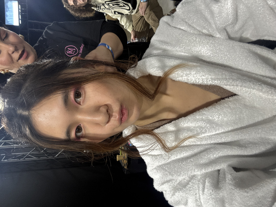 The image depicts an indoor scene in Issy-les-Moulineaux, France, likely a backstage or preparation area. In the foreground, a person of East Asian ethnicity with long brown hair, styled with loose waves around the face, is visible from the chest up. They wear a white, fluffy bathrobe over a brown garment, have pink eyeshadow, and are looking directly at the camera with slightly puckered lips. Behind and to the right of the foreground subject, a second individual, a person with lighter skin and dark hair pulled back, is actively styling the first person's hair. This individual wears a black long-sleeved shirt with a pink "EM Marbeuf" logo and a blue and white wristband on their right wrist. They also wear gold-colored earrings. In the background, further to the right, a third person, a male with long curly dark hair and glasses, is seated, holding a clear plastic bottle. He wears a light-colored sweater with a black, abstract, swirling design and brown pants, looking towards the right side of the frame. The environment features a dark background, possibly black drapes or walls, with metal trussing visible in the upper left portion, suggesting event infrastructure. A small table with a yellow cup and other items is partially visible on the far left. The lighting is artificial, illuminating the subjects.