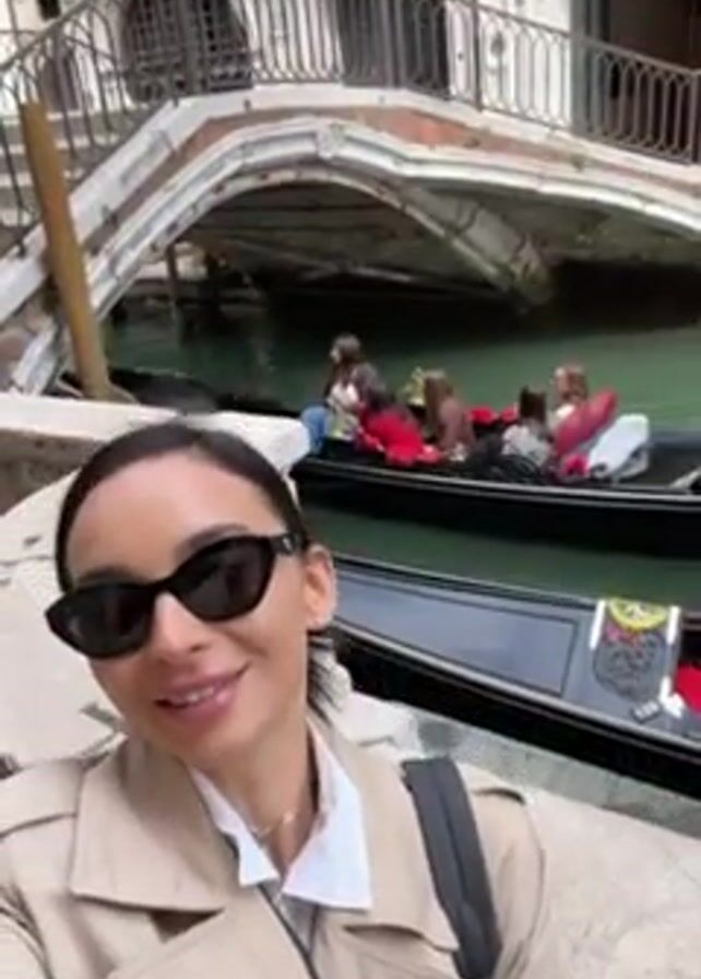 A woman in a tan trench coat and sunglasses is recording a selfie video in Venice, Italy