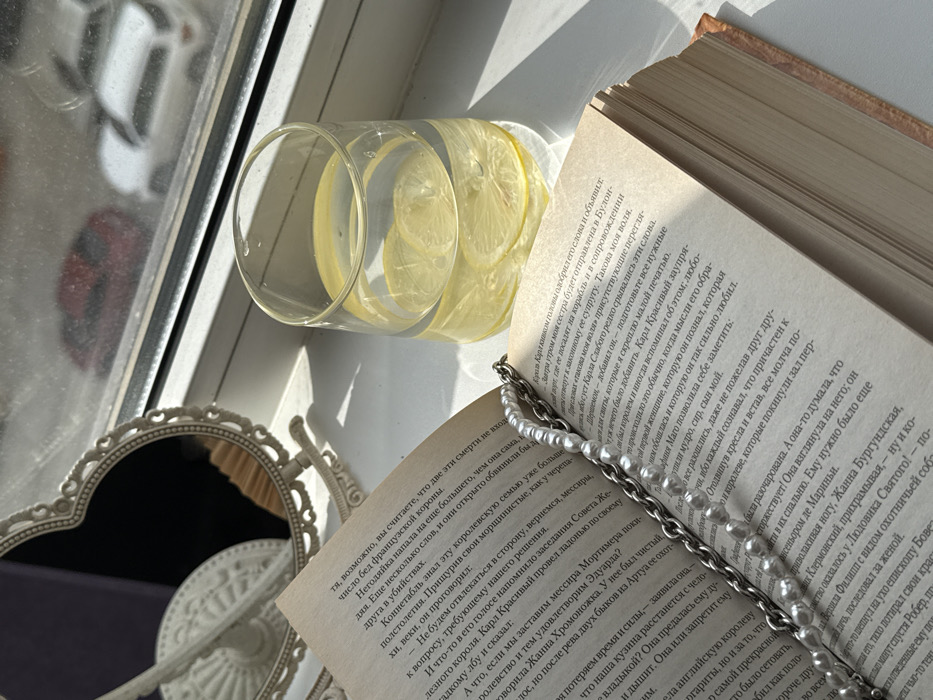 An open book with Cyrillic text lies on a white windowsill, marked by a draped pearl necklace and a linked silver-colored chain. To its right, a clear glass contains water with multiple lemon slices. On the left, an ornate, heart-shaped white mirror reflects a portion of another decorative white object. Strong sunlight illuminates the scene, casting shadows on the sill. Through the window, a blurred outdoor view reveals a red car and a white SUV on what appears to be a street or parking area. The scene is located on a windowsill in an interior room, overlooking an urban or suburban street. No individuals are present.