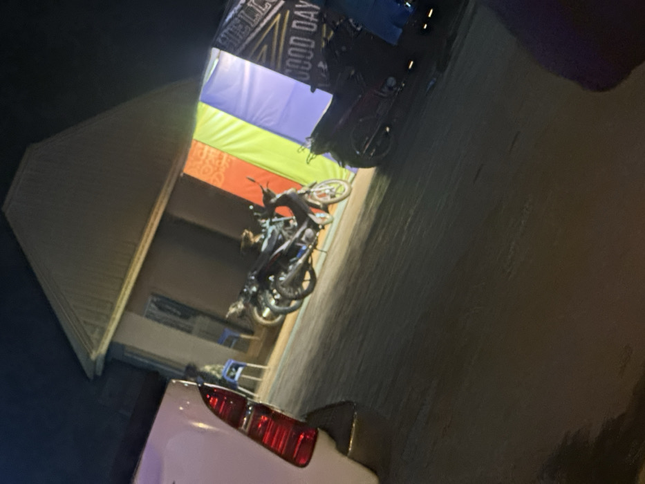 A sideways shot reveals a street scene at night. Colorful awnings hang over a building beside parked motorcycles and scooters. The back of a white car with bright red taillights is in the lower left corner. The street and surrounding areas are poorly lit, contributing to the image's indistinct quality.