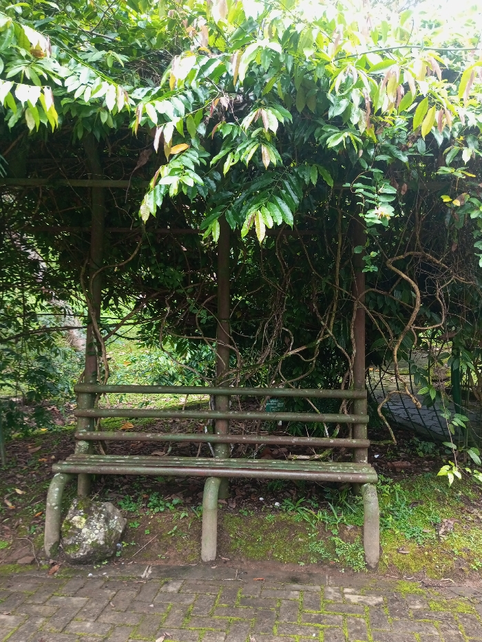 The image captures an unoccupied outdoor scene in Kanand, India. A weathered green-brown bench, constructed from horizontal slats for the seat and backrest and featuring thick, curved legs, occupies the center foreground. This bench shows signs of moss and environmental exposure. It is positioned on an earthen ground with sparse green vegetation and moss. A large, moss-covered rock rests to the immediate left of the bench's left leg. Above and behind the bench, a dark-colored support structure, resembling an arbor or pergola, is heavily enveloped by a dense canopy of green foliage and numerous thick, winding vines. The immediate foreground consists of a paved surface made of interlocking concrete or stone pavers, which also display patches of moss. No individuals or active subjects are present.