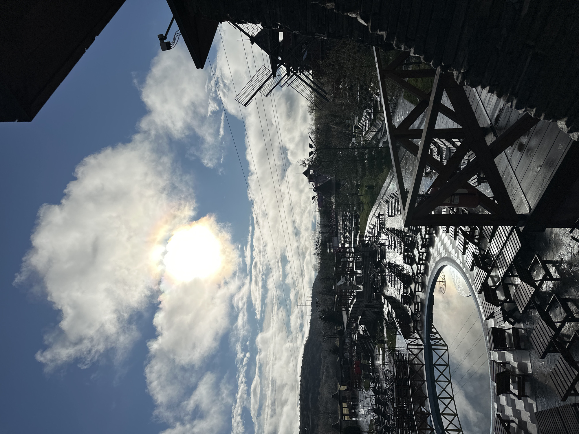 The image displays an outdoor leisure complex in Gorna Malina, Bulgaria, observed from an elevated perspective. The sky is partially blue with scattered white cumulus clouds, and the sun is centrally positioned, causing significant glare and halo effects, reflecting brightly off wet surfaces. In the immediate right foreground, a dark, rough-hewn stone wall is partially visible, alongside a sturdy wooden railing featuring cross-bracing. A red fire extinguisher is mounted on a post behind this railing. The midground primarily consists of a resort-like area. A circular swimming pool with dark, reflective water mirroring the sky is situated to the left. Numerous unoccupied wooden sun loungers and small tables are arranged around the pool and across extensive wet, paved or tiled areas. These surfaces reflect the bright sunlight. Various dark architectural structures are present, including a prominent multi-paneled structure resembling a large, partially dismantled windmill on the right, and a smaller building with a conical roof further to the left. Multiple tall streetlights with multi-fixture heads are distributed throughout the complex. In the background, a dark, treed hillside or mountain range is visible, with trees appearing bare. Utility lines stretch horizontally across the upper midground. No individuals are present within the scene, and no actions or interactions are depicted. The wet appearance of the ground and furniture suggests recent precipitation.