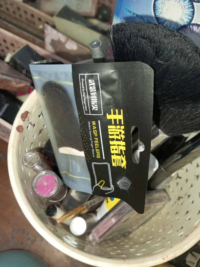 A white, round, woven basket holds various cosmetics and makeup tools. Prominently featured is a black package labeled "WASP FEELERS Mobile Gaming Finger Sleeve," with Chinese characters above the English text. The package also displays an image of a hand using a smartphone. Other items in the basket include lipsticks, brushes, and miscellaneous cosmetic containers. A blue contact lens case can be seen in the background.