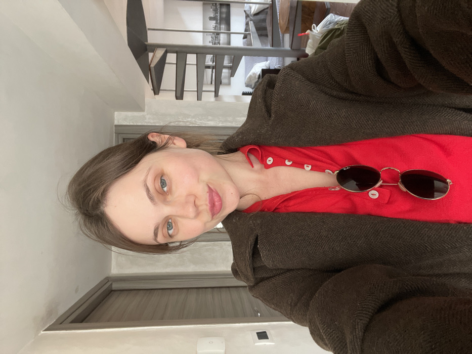 A front-facing, waist-up selfie captures a young adult female indoors within a residential setting in Cava de' Tirreni, Italy. The female has light brown hair, blue eyes, and fair skin, displaying a slight smile. She is dressed in a red collared shirt with white buttons and a dark brown, herringbone-patterned coat. Dark-lensed, round sunglasses with a thin gold-toned frame hang from her shirt's placket. The background on the left reveals a textured light-colored wall, a light-toned interior door frame, a white wall-mounted control unit, and a dark rectangular switch. On the right, a modern dark grey spiral staircase leads upwards. Beyond the staircase, a living area is visible, featuring a sofa with striped cushions and a large framed black-and-white print depicting a cityscape skyline. A circular dark wood table and multiple plastic bags are partially visible in the lower right. The ceiling is white.
