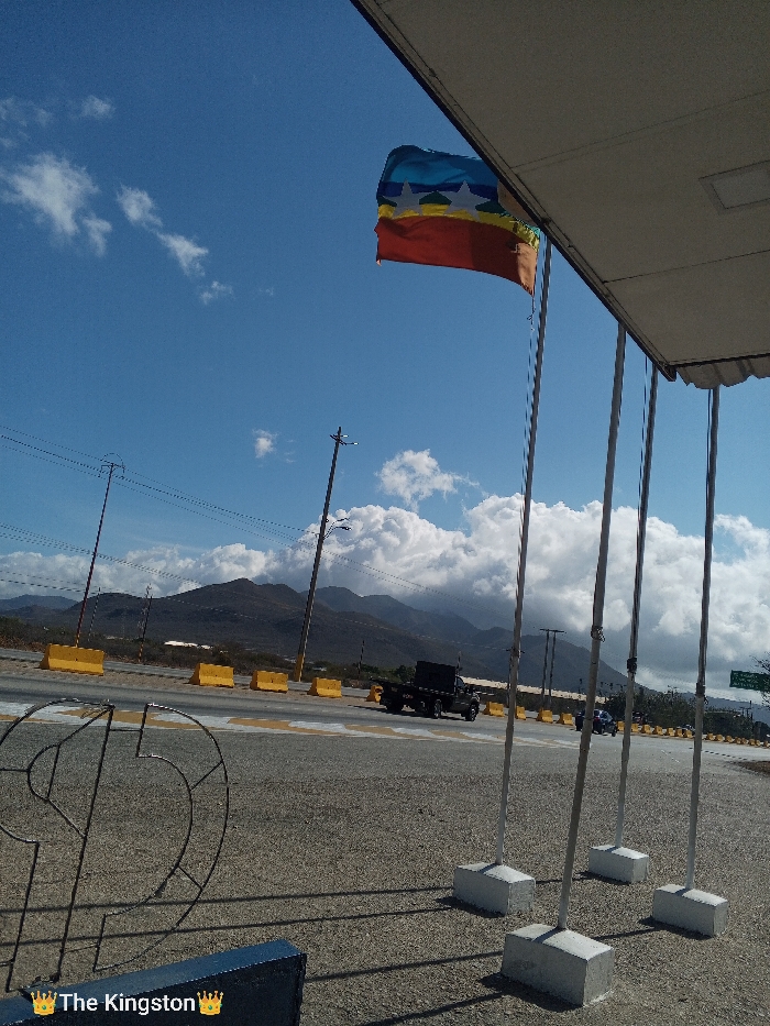 The image presents an outdoor scene in El Dátil, Venezuela, under a bright blue sky with scattered white cumulus clouds. In the distant background, a range of dark, rugged mountains is visible. A multi-lane asphalt road with white and yellow markings crosses the midground, bordered on its far side by a series of rectangular yellow concrete barriers. A dark-colored flatbed truck is observed traveling leftward on the road, and a smaller, indistinct vehicle is further ahead. Multiple utility poles with overhead power lines stand parallel to the road, one exhibiting a distinctive circular top design. In the immediate foreground, a textured ground surface, appearing to be gravel or packed earth, is visible. On the left side of the foreground, a skeletal metal structure, possibly decorative, forms a stylized circular or 'P' shape. To the right, four flagpoles with white, rectangular concrete bases are anchored in the gravel. These flagpoles extend upward, partially obscured by a light-colored architectural overhang positioned in the upper right. One flagpole, visible above the overhang, flies a multi-colored flag with horizontal stripes of blue, yellow, and red, adorned with five white stars on the yellow stripe, unfurled by the wind. Strong, direct sunlight illuminates the scene, casting defined shadows on the ground.