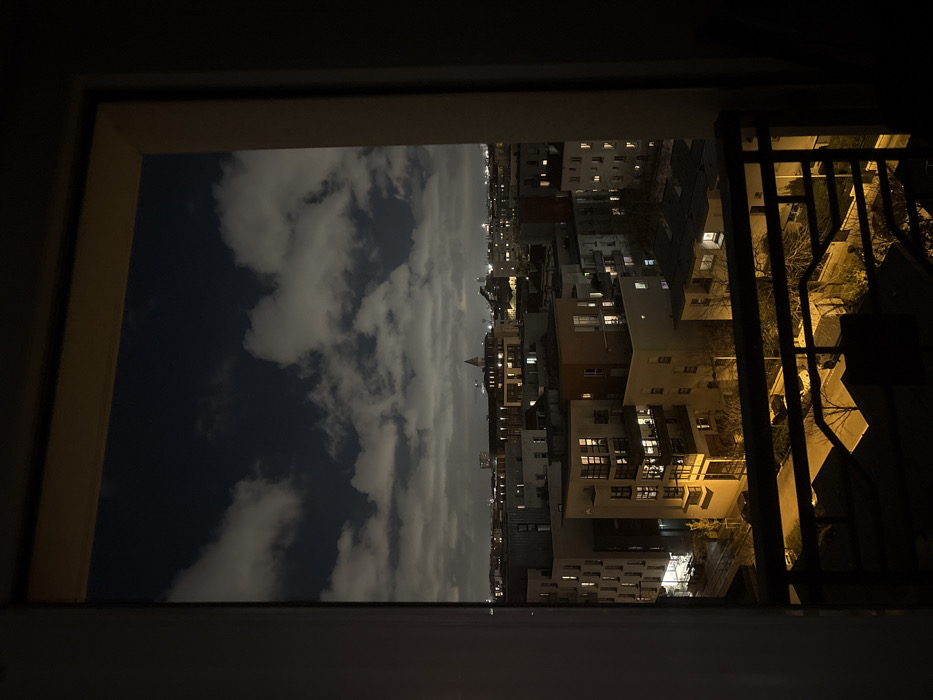 A nighttime view through a window reveals an urban landscape. To the left, a dark sky with scattered clouds is visible. In the center, buildings with illuminated windows dominate the scene. Streetlights cast an orange glow on the structures. A dark railing partially obscures the right side of the view, suggesting a balcony or terrace setting. The overall impression is one of a quiet, densely populated city under the night sky.