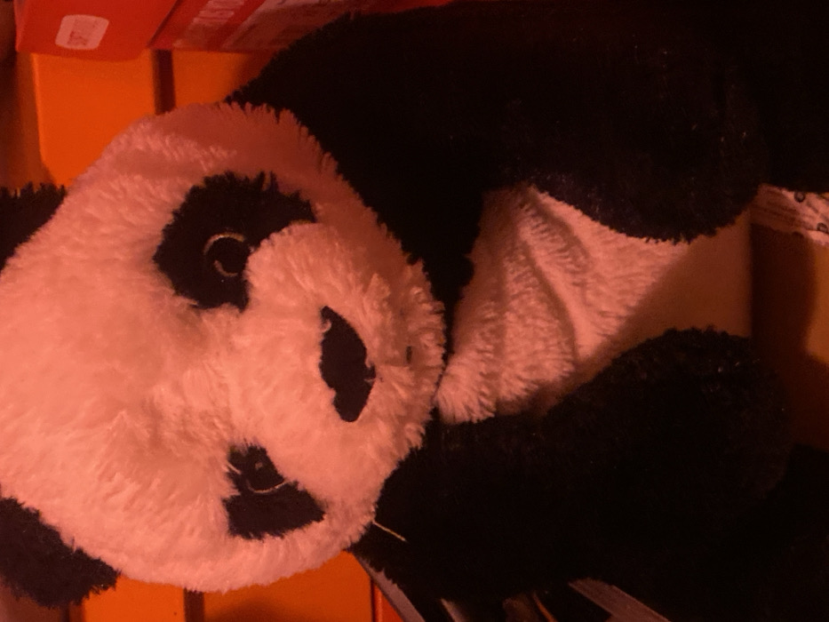A stuffed panda toy lies horizontally, its white face with black eye patches and nose prominent. The rest of its body is black and white. An orange object is partially visible behind the panda's head. The lighting gives the scene a reddish tint.