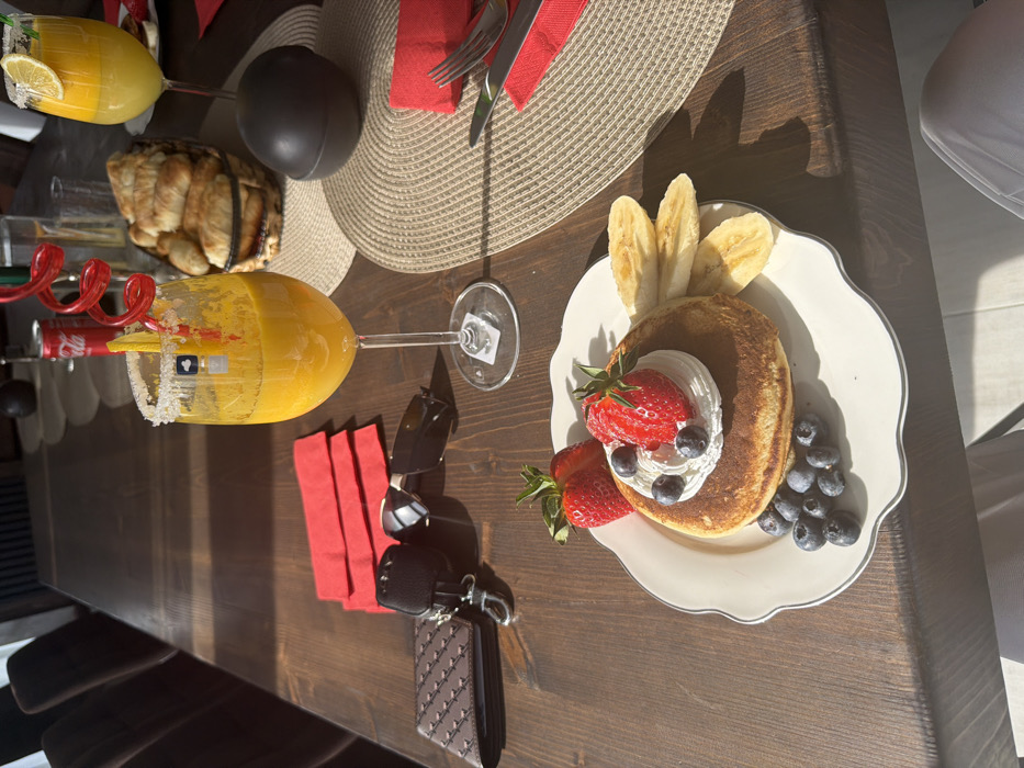 A dining table in Kostinbrod, Bulgaria, is set for a meal, illuminated by strong natural sunlight casting distinct shadows. In the foreground, a white, scalloped-edge plate holds two pancakes topped with whipped cream, two whole red strawberries, and multiple dark blueberries. Sliced bananas are fanned out on the right side of the plate. To the left of the plate, a brown patterned wallet, a car key fob with a single key, and dark sunglasses are placed on the dark brown wooden table. A stack of four folded red paper napkins rests above these personal items. In the mid-ground, a stemmed glass containing an orange liquid is present, featuring a sugar-rimmed edge, a yellow lemon wedge, and a red spiral straw. A small white label with a black symbol is affixed to the glass. This glass is positioned on a light beige, woven circular placemat. Further right, another similar placemat holds a folded red napkin with a silver fork and knife. Another stemmed glass, identical in style, also containing an orange liquid with a sugar-rim and lemon slice, is situated on this placemat. A dark wicker basket filled with multiple crescent-shaped pastries and a matte black spherical object are positioned between the second glass and the background. A red Coca-Cola can is partially visible in the blurred background. Dark upholstered chairs are visible along the length of the table in the background.