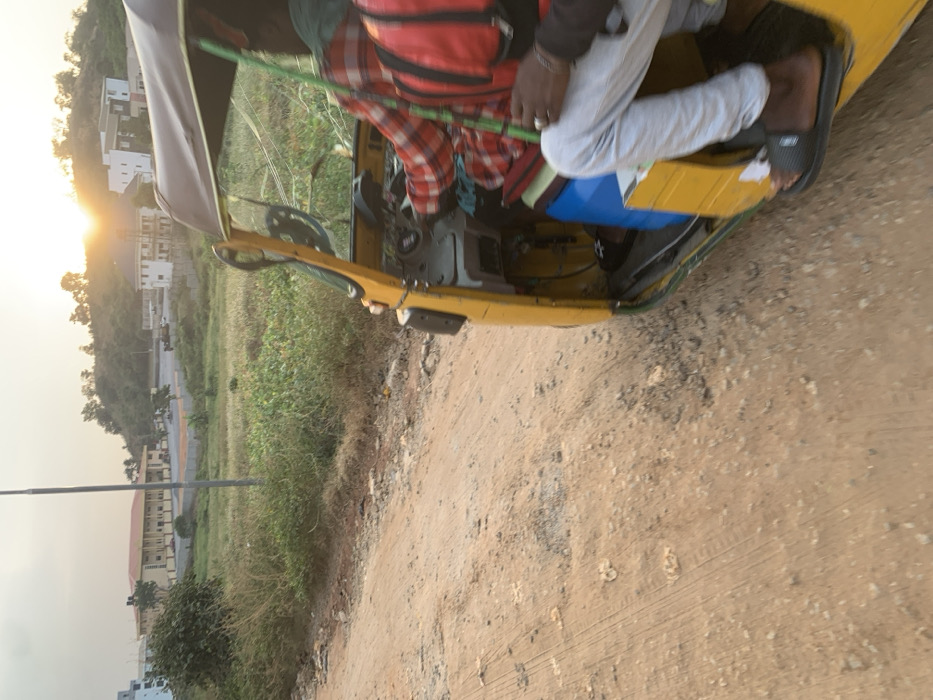 A yellow auto-rickshaw is parked on a dirt road, with a partially visible driver and passenger. The passenger wears gray pants and black sandals. The driver is wearing red and white. In the background, a grassy area slopes upwards towards a cluster of buildings, with the sun shining brightly above. A tall utility pole is visible. The ground is dry and uneven, showing evidence of tire tracks.