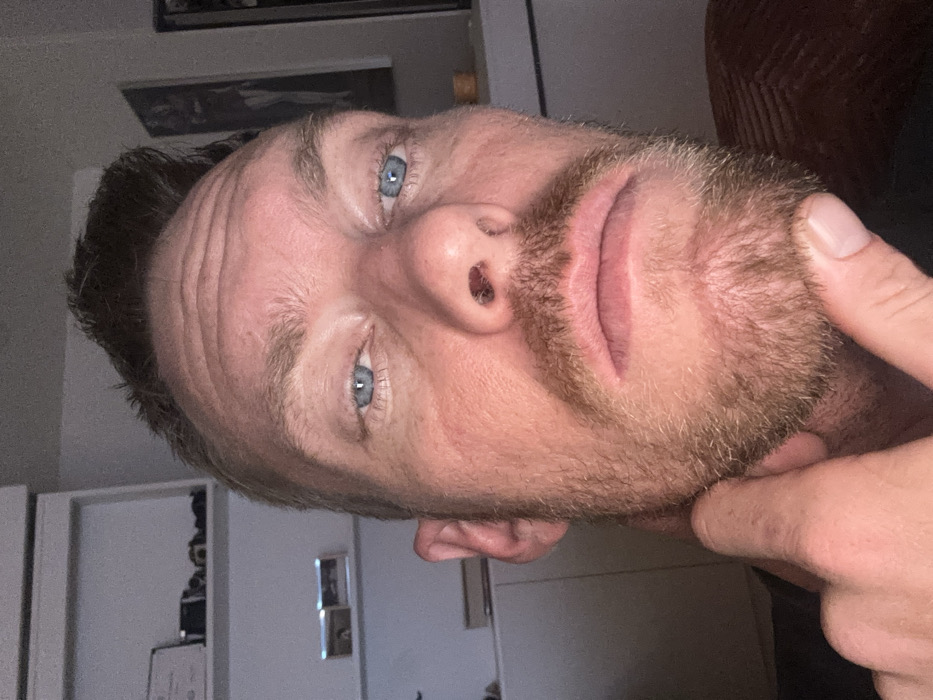 A close-up portrait reveals a man with fair skin, blue eyes, and a trimmed beard