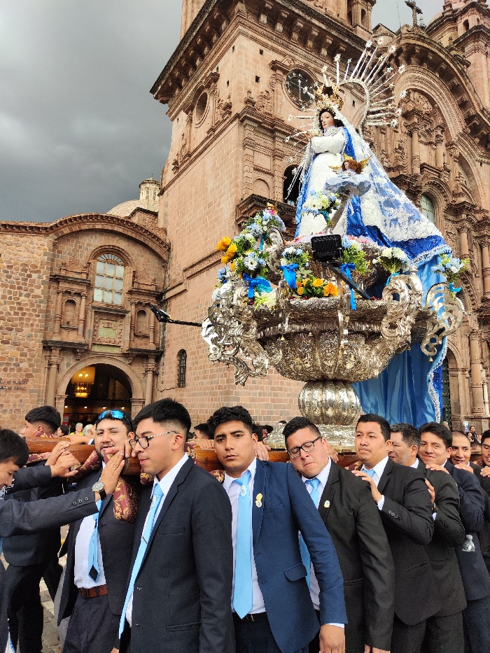 A religious procession takes place outside a stone church with a clock tower. A statue of a woman, adorned with blue and white fabric and a halo, is carried on an ornate silver platform by a group of men in suits and light blue ties. They bear the weight of the statue on a wooden beam across their shoulders. Dark clouds loom in the sky above the church.