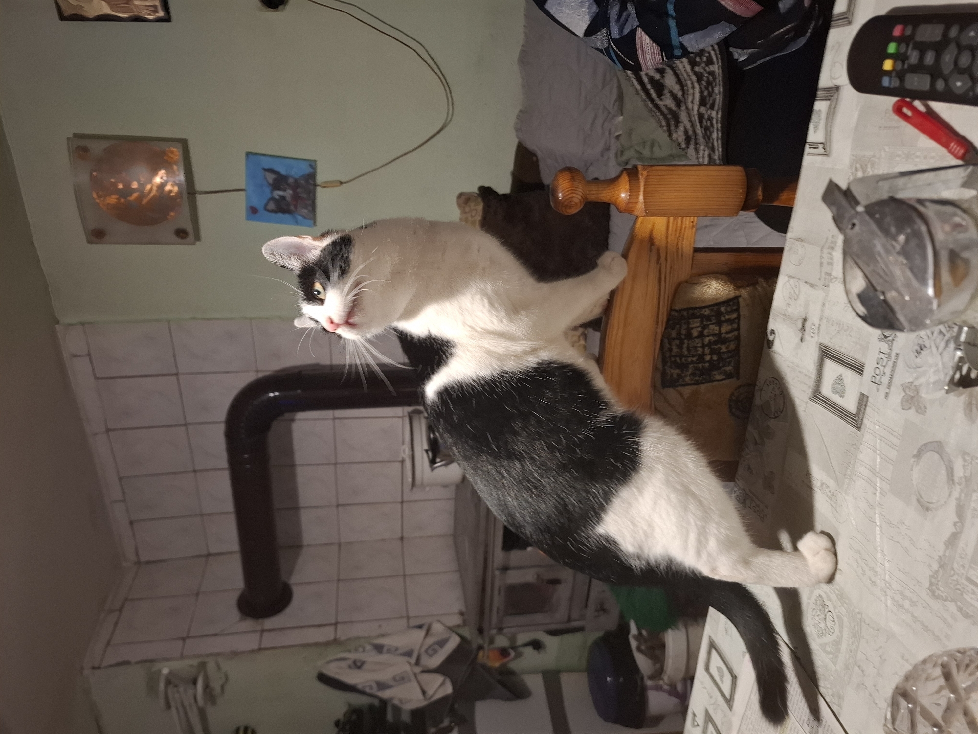 A black and white cat is sitting on a wooden chair next to a table covered with a patterned tablecloth. On the table, there is a TV remote, a metallic object, and other items. In the background, there is a tiled wall with a black pipe and a small cabinet. The photograph was taken indoors, presumably in a home located in or around Samokov, Bulgaria.