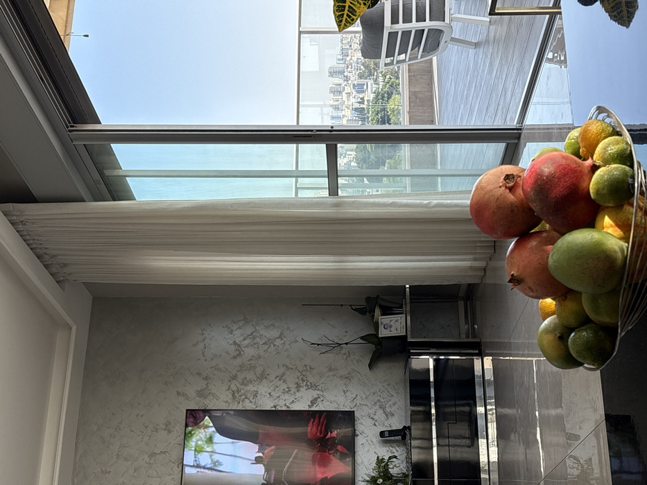 The image depicts an indoor living space looking out onto an outdoor balcony and a city panorama in Rishon LeZion, Israel