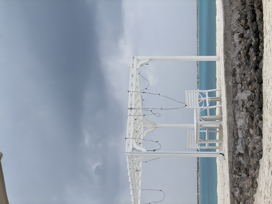 A seaside view with an overcast sky. A white pergola frames a table and chairs set. The structure is adorned with hanging string lights. To the right, a textured concrete wall stands near the water's edge. The sea fades into a lighter sky in the background.