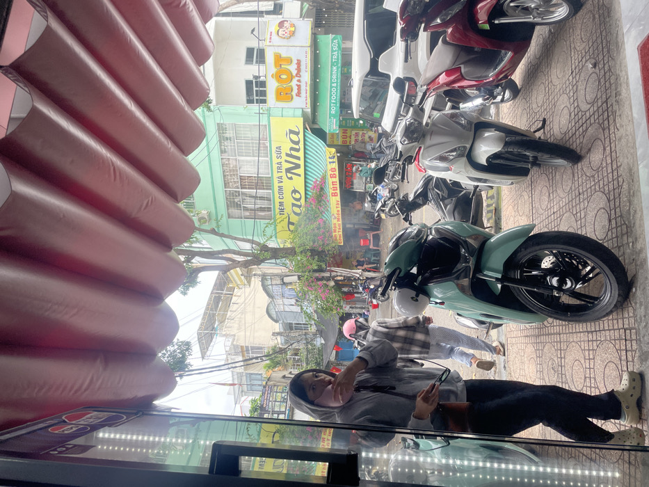 A street scene shows parked motorbikes and shops. Signs read "TIỆM CƠM VÀ TRÀ SỮA Tao Nha", "ROT Food & Drinks", and "Bún Bò 16 ROT FOOD & DRINK - TRÀ SỮA." A person in a hoodie, pants, and Crocs stands in the foreground, partially reflected in a window. The image is slightly tilted. A textured, pink canopy is visible on the left.