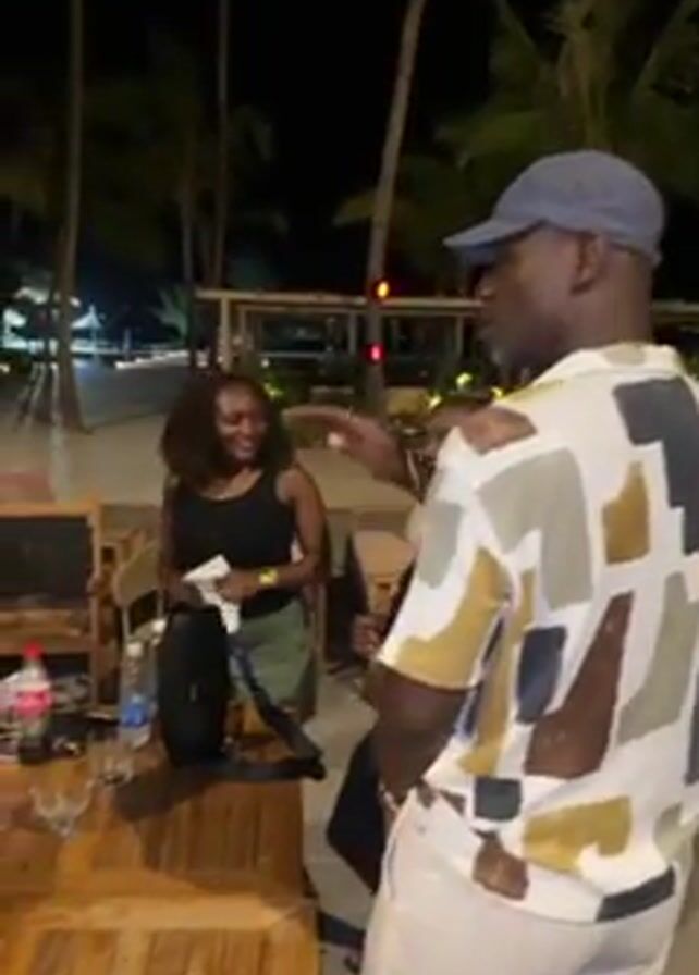 group of adults at an outdoor gathering at night. People are dancing and clapping around a large wooden table. Bottles of water and other drinks are on the table. Palm trees are visible in the background. There is a building with lights in the distance.