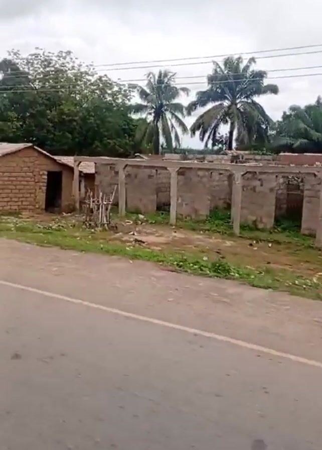 The video depicts a roadside scene, likely in a rural or developing area. The camera is moving, suggesting it's being filmed from a vehicle traveling on the road. Initially, there are small, simple dwellings visible, constructed with basic materials like mud bricks and corrugated metal roofs. The landscape includes trees, including palm trees. As the video progresses, a man on a motorcycle comes into view, heavily laden with multiple large containers stacked and strapped to the back of his bike. He is wearing an orange shirt and a patterned cap. The video then shows small roadside shops or stalls, also constructed from basic materials. There are other parked motorcycles and at least one car in the vicinity. The sky is overcast.