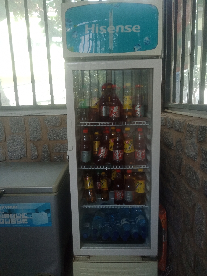 This image depicts an interior or semi-outdoor commercial scene in Tarauni, Nigeria. A prominent white Hisense brand upright display refrigerator, featuring a glass door, is stocked with various bottled beverages across four shelves. The top three shelves contain an assortment of carbonated drinks and juices in bottles with primarily red and yellow labels, while the bottom shelf is densely packed with blue-capped plastic water bottles laid horizontally. To the immediate left of the refrigerator, a light grey SKYRUN branded chest freezer is partially visible. Both appliances are positioned against a wall constructed of rough, irregular dark grey stones with light grey mortar joints. On the left side of the frame, a window with multiple vertical metal bars allows natural light to enter, with blurred green foliage visible outside. A small portion of an orange object and a metal rack are partially visible against the stone wall on the right. No individuals are present in the scene.
