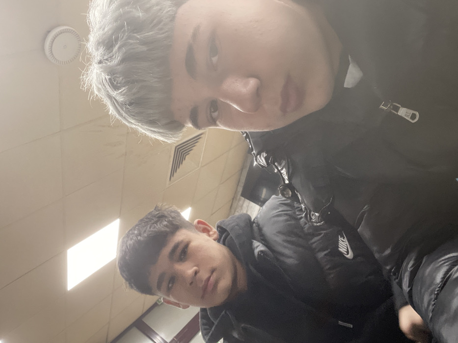 The image displays two young males in an indoor setting, appearing to be a close-up selfie