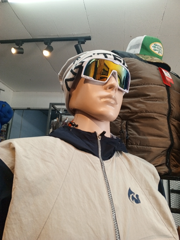 The image displays the interior of a retail clothing store, purportedly located in Baza, Myanmar. In the foreground, a light-toned mannequin's head and upper torso are visible, angled slightly to the viewer's right. The mannequin wears a light gray beanie with a dark geometric pattern and large, white-framed wraparound sunglasses with iridescent, golden-orange mirrored lenses that reflect overhead lighting and other elements of the store. It is dressed in a two-toned jacket, featuring a light beige body and dark blue sleeves and hood, secured with a silver zipper. A small, dark blue stylized logo, resembling a bird or flame, is present on the left chest of the jacket. To the right and behind the primary mannequin, another mannequin's upper torso is visible, wearing a green and white mesh baseball cap with a circular emblem and a dark brown, quilted puffer-style vest or jacket with a red tag attached near the shoulder. The ceiling is white, equipped with a black track lighting system featuring three active spotlights. A dark metal display rack and a blue object are partially visible in the background on the left.